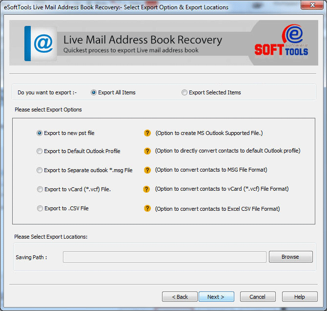 Best application available to recover live mail address book: Windows live mail users can now recover their live mail address book with unlimited contacts by using eSoftTools advance live mail address book recovery software. Download this available tool to recover live mail address book and also convert to other file formats. Here, software available with multiple functions which involves recover and conversion of live mail contacts to PST, MSG, HTML, vCard, TXT and CSV format.